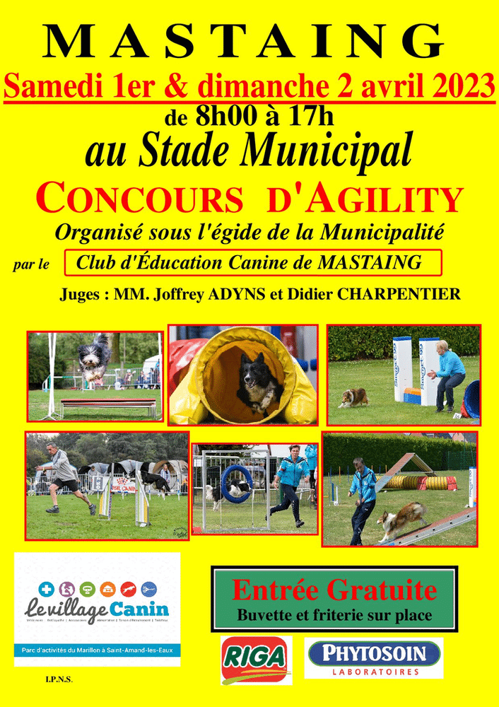 Les samedi 1er et dimanche 2 avril 2023 aura lieu notre concours d’agility au terrain de football de Mastaing.